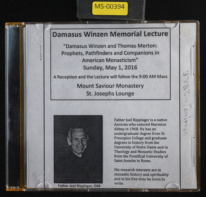 Additional text: 2016 Winzer Lecture | May\nA Reception and the Lecture will follow the 9:00 AM Mass\nSt. Josephs Lounge\nFather Joel Rippinger is a native Auroran who entered Marmion Abbey in 1968. He has an undergraduate degree from St. Procopius College and graduate degrees in History from the University of Notre Dame and in Theology and Monastic Studies from the Pontifical University of Saint Anselm in Rome.\nHis research interests are focused in the area of monastic history and spirituality and he has published numerous articles and three books on this topic.