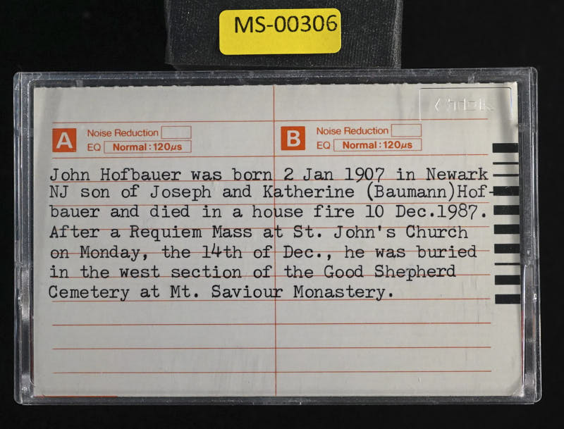 Additional text: John Hoffbauer was born 2 Jan 1907 in Newark NJ son of Joseph and Katherine Baumann Hoffbauer and died in a house fire 10 Dec. 1987. After a Requiem Mass at St. Johns Church on Monday, the 14th of Dec., he was buried in the west section of the Good Shepherd Cemetery at Mt. Saviour Monastery.