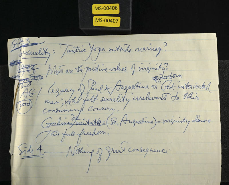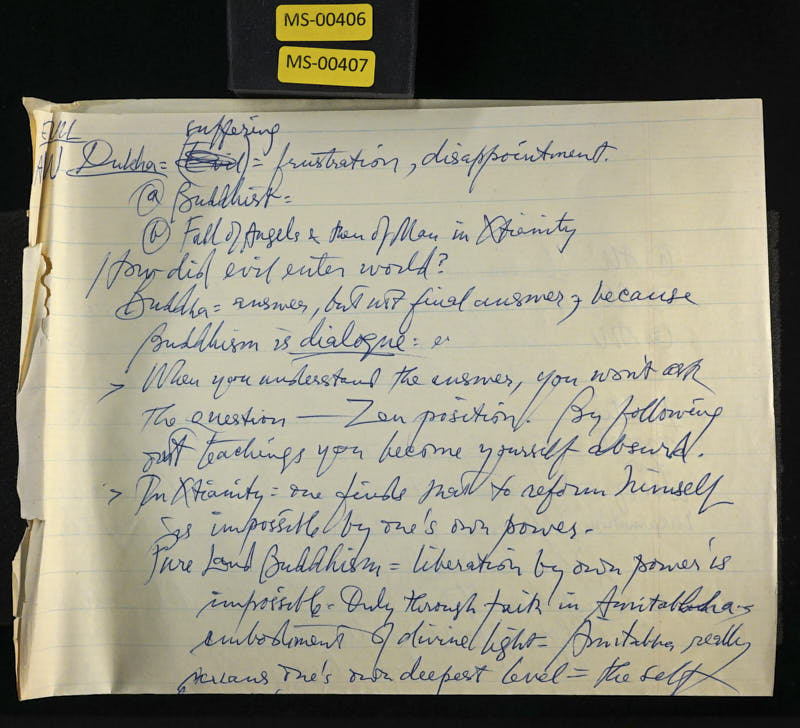 The second question was what view are we going to take about the origination and reality of evil? Is there evil in the world in the sense of deliberate maliciousness as traditional Christianity would aver or is there only ignorance as Buddhists would maintain? The third question was the question of theism and pantheism. Are we going to have to come to some agreement as to the idea of God? That's a very thorny and a very fascinating question which we can probably go into during this seminar. And the fourth, which we thought we might have to have some delay about, is the thorny question of the attitude of religion to sex.